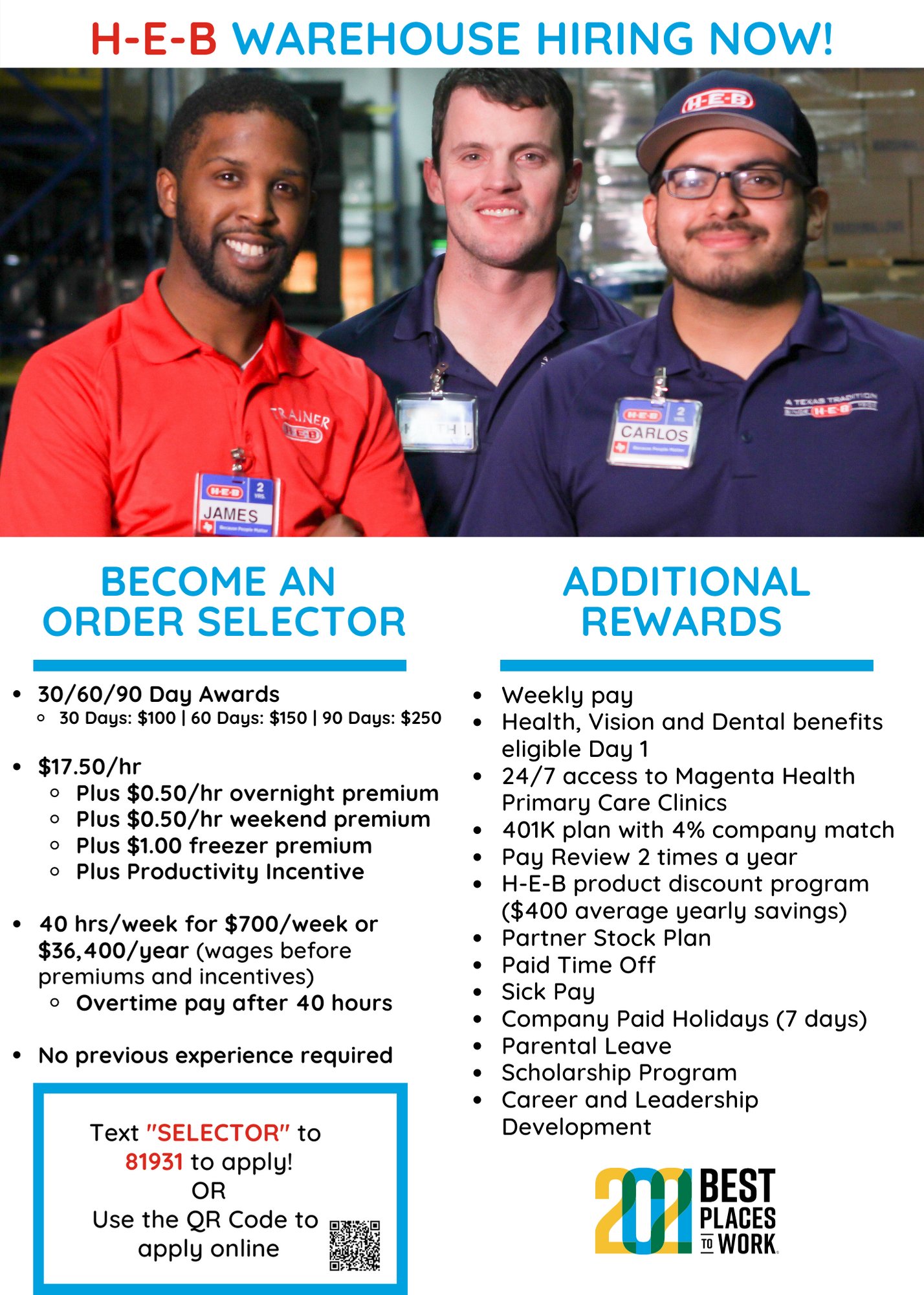 H E B Careers Our H E B Warehouses Are Hiring Order Selectors Pickers Apply Online Https Bit Ly 3bf4uov Or Text Selector To 81931 30 60 90 Day Awards 30 Days 100 60 Days 150 90 Days